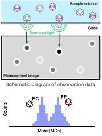 Additionally, it enables the rapid determination of the relative ratio of empty capsids (EC) to full particles (FP) in AAV vectors.