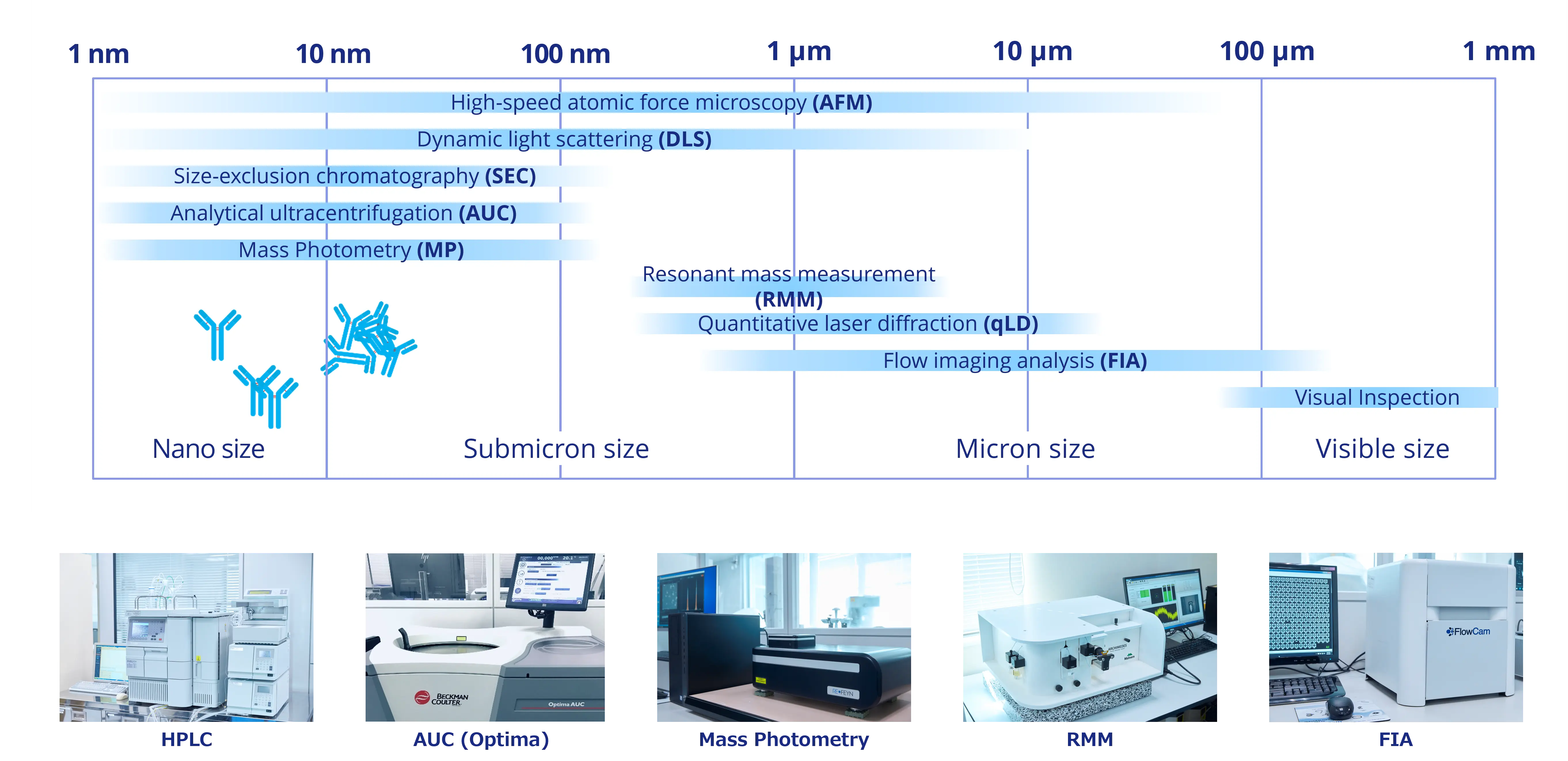 Our company offers aggregate and particle analysis for quality testing, characterization, and stability testing of biopharmaceuticals and gene and cell therapies, utilizing optimal analytical methods tailored to particle sizes ranging from tens of nanometers to hundreds of micrometers.