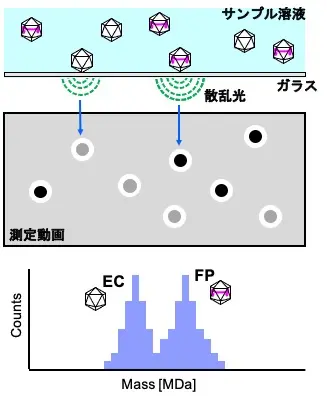 Mass Photometry(MP)法は、ガラス基板表面上の試料(1分子)の散乱光強度から、溶液中の生体分子(核酸、タンパク質、AAVベクター、凝集体等)やナノ粒子の分子量を測定する方法です。抗体の会合状態の分析、相互作用解析、AAVベクターの完全粒子・空粒子比の定量などが可能です。MP法では、数十µLの微量なサンプルで測定可能な点が特徴です。