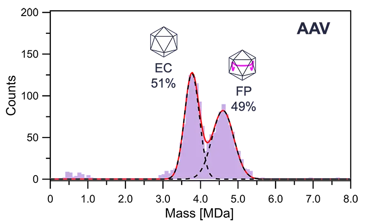 また、AAVベクターの、空粒子(Empty capsid:EC)、完全粒子(Full particle:FP)の相対比率を短時間で求めることができます。