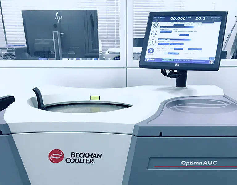 当社は、創業以来15年以上にわたりAUCの解析技術を磨き続け、豊富な実績を有しています。国内外のバイオ医薬品分野におけるリーディングカンパニーとして、高度な解析サービスを提供しています。また、当社はProteome Lab XL-A(蛍光検出器搭載)、XL-I、Optima 3台の計5台を保有し、多様な測定ニーズに対応可能です。